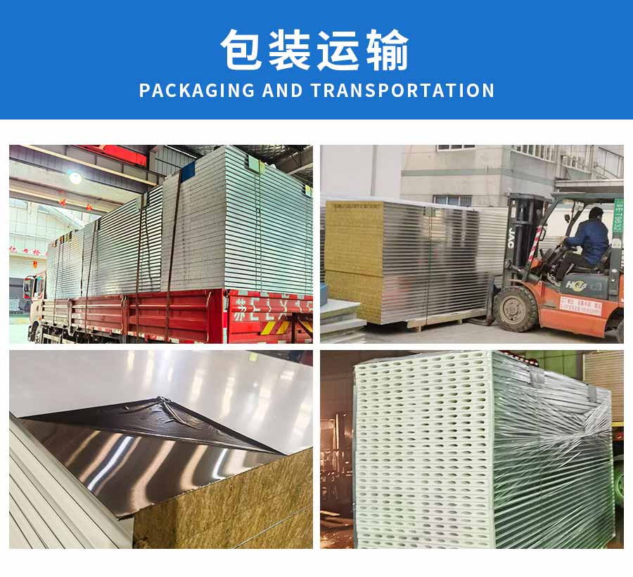 巖棉彩鋼夾芯板其芯材是以玄武巖及其它天然礦石等為主要原料,經高溫熔融成纖維,加入適量粘結劑,固化加工而制成的。是同類(夾芯板系列)中耐火性能最強的一種新型防火板材。